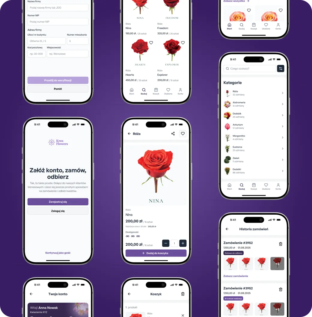Profesjonalny wizerunek – nowoczesna aplikacja mobilna buduje postrzeganie Krox Flowers jako innowacyjnej firmy, która inwestuje w technologię i wygodę klientów.