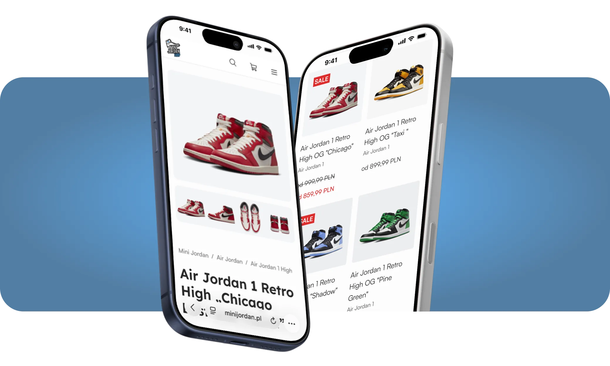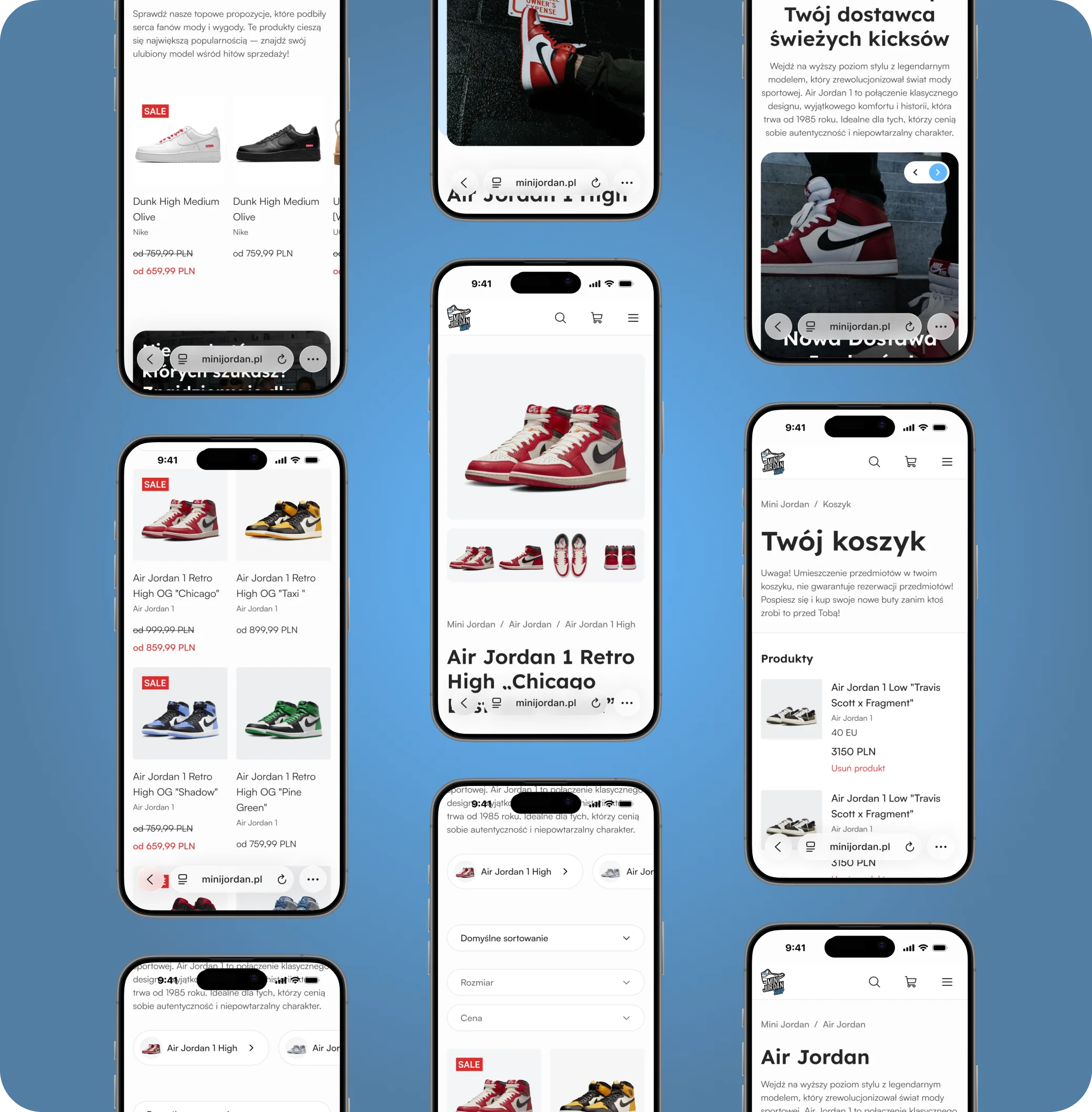 Jednym z priorytetów było również dostosowanie strony do urządzeń mobilnych, ponieważ większość użytkowników MiniJordan przegląda ofertę na telefonach. Strona została w pełni zoptymalizowana pod kątem mobilnym – działa płynnie, szybko się ładuje, a jej układ dostosowuje się do różnych rozdzielczości ekranów. Proces zakupowy został uproszczony tak, aby klienci mogli w kilku krokach sfinalizować zamówienie bez konieczności przewijania czy powiększania treści.