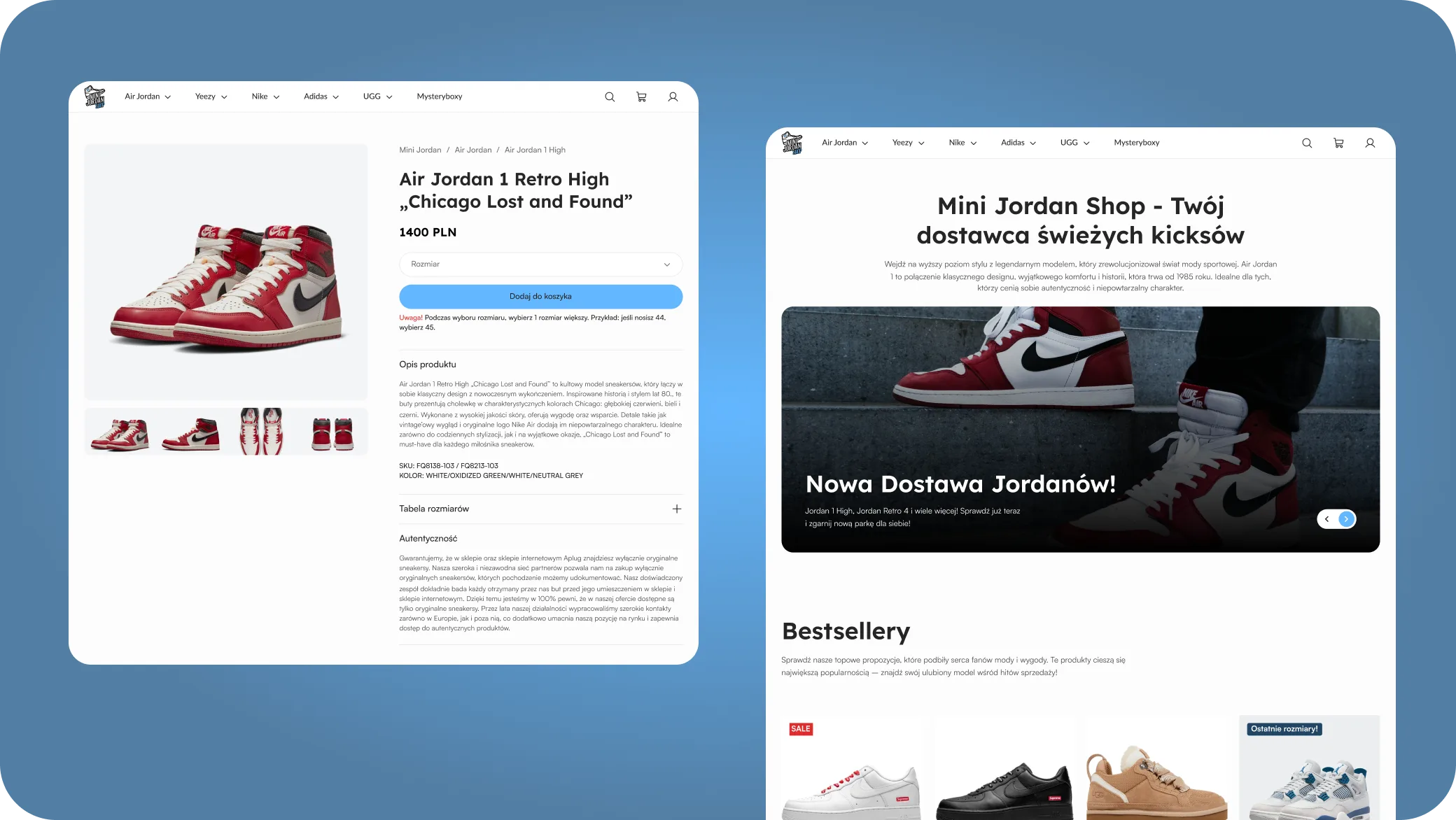 MiniJordan to sklep internetowy specjalizujący się w sprzedaży limitowanych i hypowych butów oraz odzieży streetwearowej. Projekt miał na celu stworzenie estetycznej, nowoczesnej i funkcjonalnej witryny, która odda ekskluzywny charakter oferowanych produktów i zapewni użytkownikom wygodne zakupy. Sklep miał być intuicyjny, przejrzysty i dopasowany do oczekiwań grupy docelowej – młodych, modowych entuzjastów ceniących wysokie standardy.